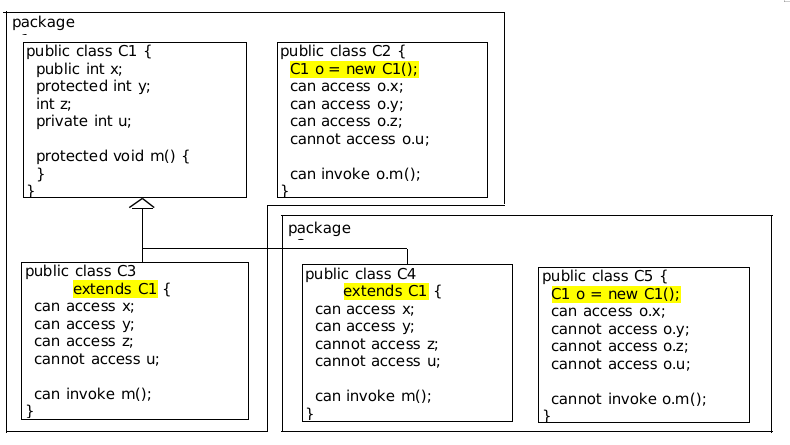 现在我们可以完整访问修饰符了。有了继承后,有了一个新的修饰符叫做 protected比 public更严格比 缺省 更宽松;其含义是允许其子类型拥有完全的访问,而不关心是否在同一个包当中。记住下面这张表格就可以了。