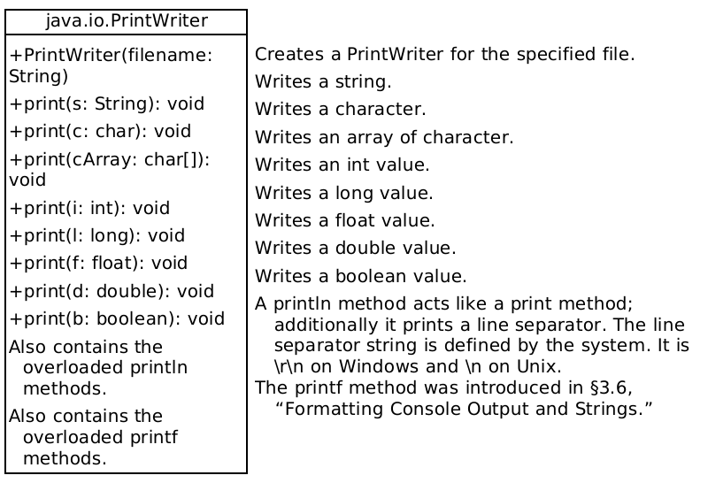 A File object encapsulates the properties of a file or a path, but does not contain the methods for reading/writing data from/to a file. In order to perform I/O, you need to create objects using appropriate Java I/O classes. The objects contain the methods for reading/writing data from/to a file. This section introduces how to read/write strings and numeric values from/to a text file using the Scanner and PrintWriter classes.